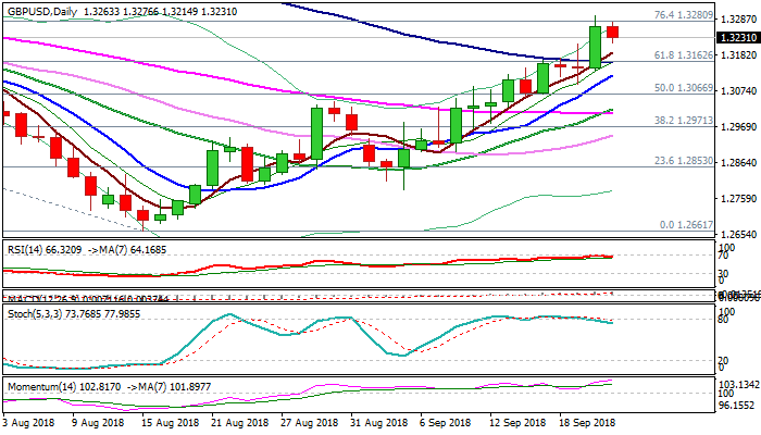 Pullback from new 2 ½ month high at 1.3297 could extend as profit-taking and softer tone on the latest news, as well as reversal of daily slow stochastic from overbought territory, weigh on near-term action.