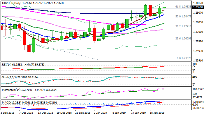 Technical studies on daily chart remain bullish, with positive signal being generated on Tuesday’s close above 1.2953 (Fibo 61.8% of1.3297/1.2397 descend).