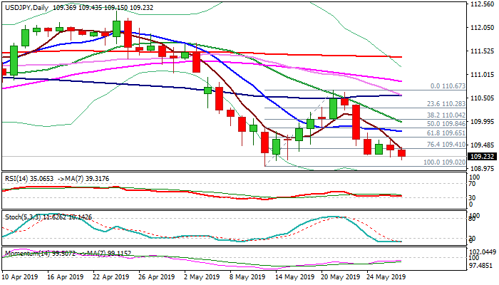 Downside pressure is maintained by full bearish setup of daily MA’s and thick weekly cloud, but rising momentum and deeply oversold stochastic conflict and suggest that bears may face strong headwinds from key support 109.02 (13 May low) which was approached on today’s dip to 109.15.