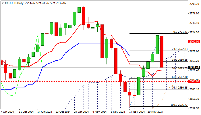 Fresh weakness cracked significant supports at $2650/48 (Fibo 38.2% of $2536/$2721, reinforced by 55DMA and the top of rising daily Ichimoku cloud) with daily close below these levels to validate negative signal and focus net targets at $2629 (50% retracement) and $2621 (10DMA), guarding $2607/00 (Fibo 61.8% / psychological).