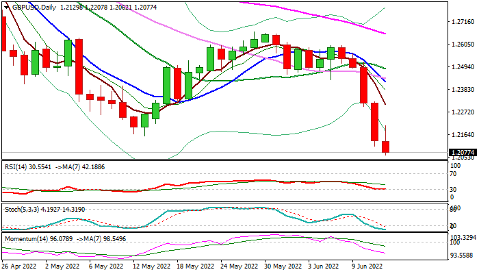 Cable extends its steep fall into fifth straight day and dented pivotal Fibo support at 1.208 (76.4% of larger 1.1409/1.4249 Mar 2020/May 2021 rally), after fresh bearish signal was generated on Monday’s close below former 2022 low at 1.2155.
