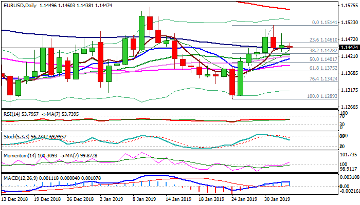 Pivotal support at 1.1428 (Fibo 38.2% of 1.1289/1.1514, reinforced by daily Kijun-sen) stays intact for now, with plethora of supports marked by MA’s and daily cloud, providing strong headwinds for bears and limiting dips.