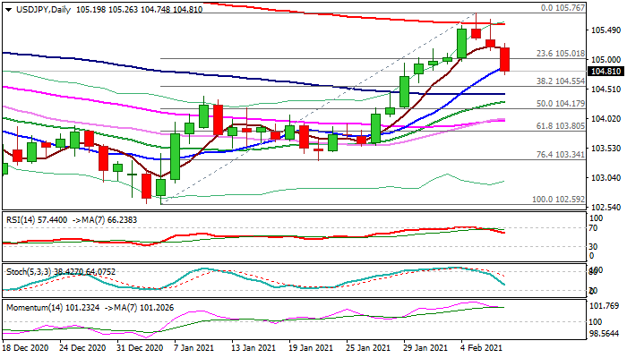 Probe below 105.00 round-figure support and nearby rising 10DMA (104.88) triggered initial stops which could fuel further weakness for test of key Fibo support at 104.55 (38.2% of 102.59/105.76), loss of which would expose next pivotal supports at 104.42/30 (100DMA / 20DMA) and 104.17/13 (50% retracement / daily cloud top).