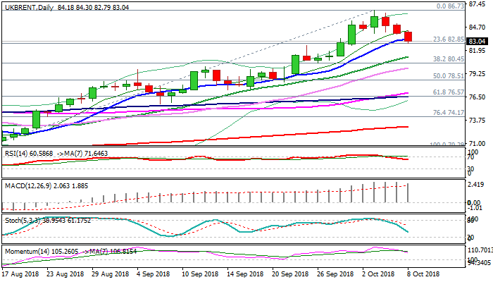 Brent oil extends pullback from new four-year high at $86.73 and broke below initial support at $83.35 (rising 10SMA), receiving negative signal from market expectations that part of Iranian oil export would continue after the US reimposes sanctions in November.