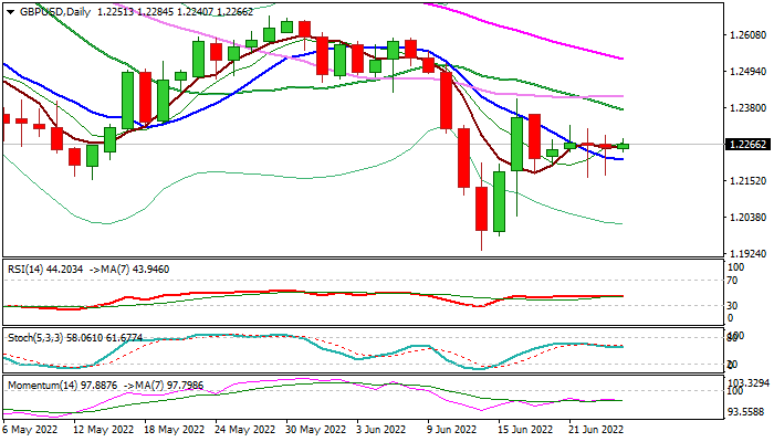 Daily Kijun-sen, which capped the action in past four days, offers strong resistance at 1.2300 and immediate bias is expected to remain bearish while the action continues to hold below this level, however, stronger signal of recovery would require acceleration and close above 1.2386/1.2406 (Fibo 61.8% of 1.2666/1.1933 bear-leg / June 16 lower top).