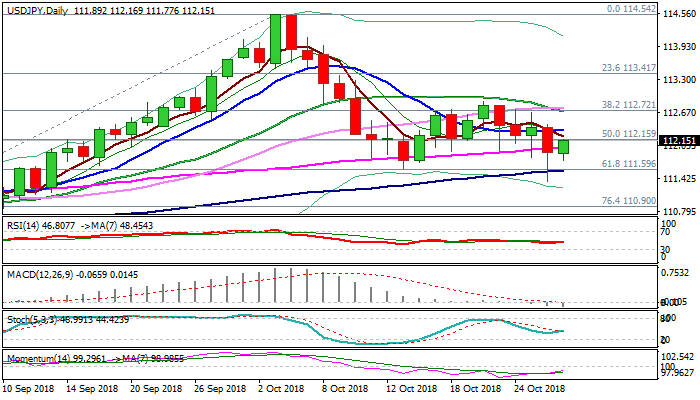 The pair probes above 112 handle on Monday, following strong downside rejection on Friday and failure to take out cracked key supports – daily cloud; Fibo 61.8% of 109.77/114.54; rising 100SMA.