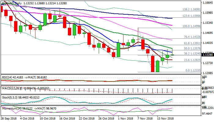 The Euro stands at the front foot on Friday, but upside attempts show strong hesitation at pivotal Fibo barrier at 1.1357 (50% of 1.1499/1.1215 bear-leg), as probe above 1.1357 repeatedly failed and was capped by falling 20SMA.