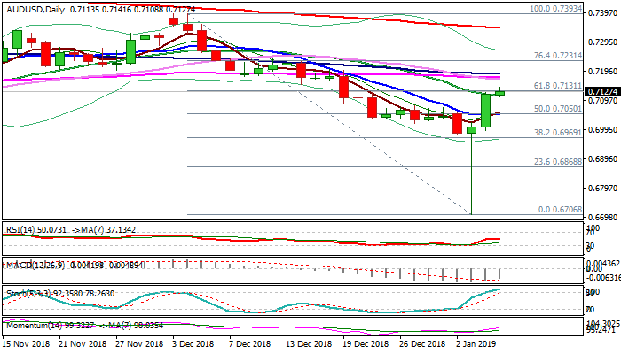 Fresh advance probes through pivotal barrier at 0.7131 (Fibo 61.8% of 0.7393/0.6706 descend), clear break of which would generate bullish signal for extension towards strong resistance zone daily between 0.7170 and 0.7222 (30/55/100SMA / daily cloud).