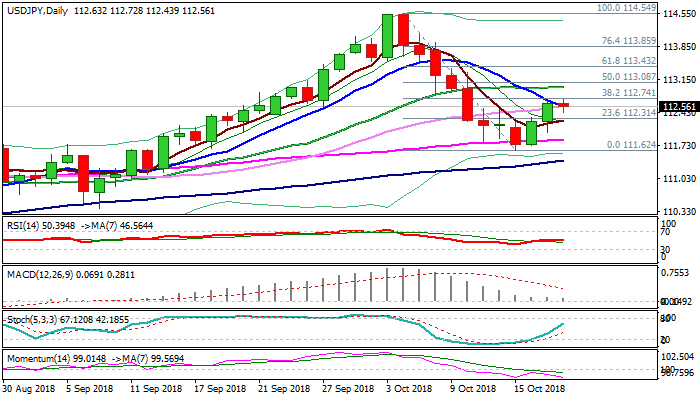 Two-day recovery from new one-month low at 111.62, boosted by reduced safe-haven demand and signals that Fed would continue to hike interest rates, faced strong resistance at pivotal 112.74 barrier (Fibo 38.2% retracement of steep 114.54/111.62 fall).