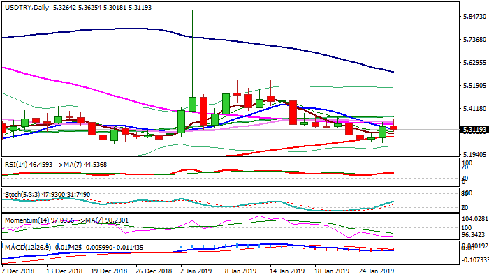 Fears that lira could extend weakness after recent rally failed to clear 200SMA exist, but the pair needs to break above 20SMA (5.3704) to confirm reversal.