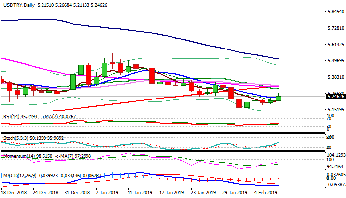 Negative signal could be expected on return below 5SMA, while extension below 5.1827 higher low would weaken near-term structure and revive lira’s bulls.