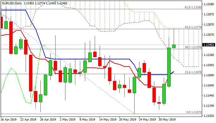 Return and close below 1.1220/15 (broken 55SMA / former high of 27 May / Fibo 38.2% of 1.1111/1.1277 recovery leg) would generate bearish signal, which will be confirmed on extension below a cluster of converged daily MA’s at 1.1185/80.
