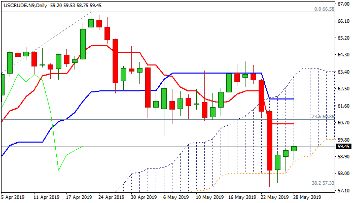 Stronger bullish signals can be expected on extension above key barriers at $59.85 (Fibo 38.2% of $63.93/$57.32) and $60.16 (200SMA), while failure to break here would generate initial negative signal, which would require confirmation on fall through cloud base / 100SMA.