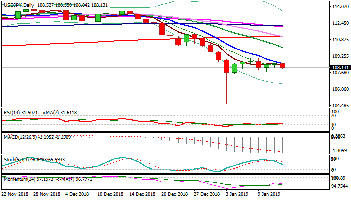 Fresh weakness pressures near-term base, formed at 108 zone, also double Fibo support (broken 38.2% of 113.70/104.59 / 23.6% of 104.59/109.08) clear break of which would generate initial reversal signal, which requires confirmation on extension and close below 107.37 (Fibo 38.2% of 104.59/109.08).