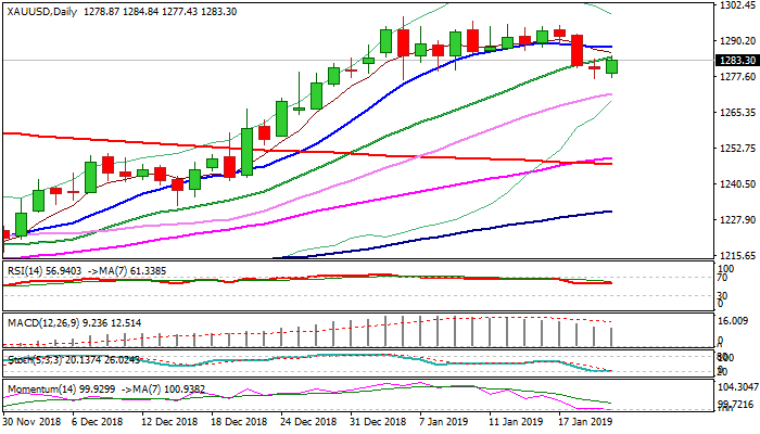 Fresh gains struggle to return above rising 20SMA ($1284), close above which is needed to complete Doji reversal pattern on daily chart and shift near-term focus towards $1287 (10SMA) and $1292 (Friday’s high).