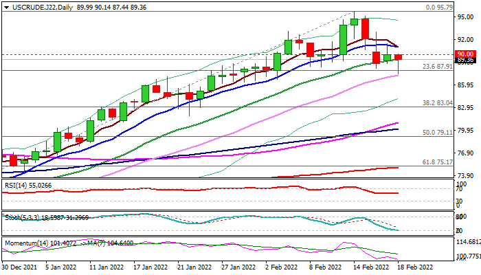 WTI oil extends pullback from new 7-year high and holding comfortably below psychological $90 level, on track for the first bearish weekly close (down over 6% for the week) after rallying for eight consecutive weeks.