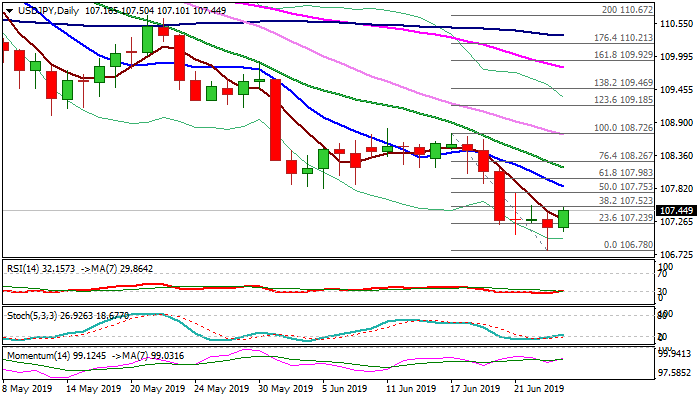 Pivotal Fibo barrier at 107.52 (38.2% of 108.72/106.78) is under pressure and break here would provide bullish signal for recovery extension towards 107.75 (50% retracement) and 107.85 (falling 10SMA).