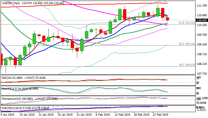South-heading daily momentum / RSI and Stochastic support scenario, as firm break below 110 handle would open way towards thin daily cloud (spanned between 109.40 and 109.02).
