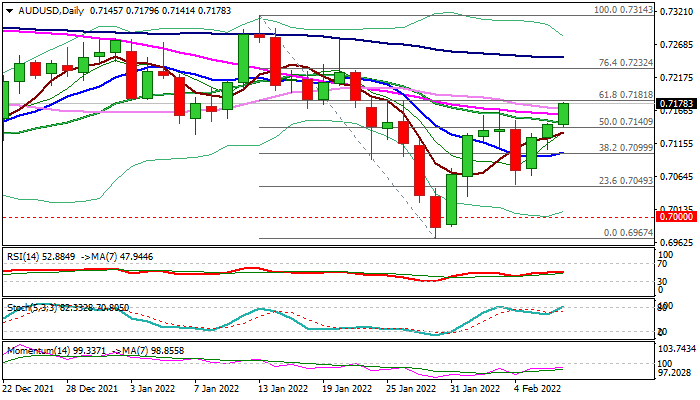 Bulls broke above last week’s high (0.7168) and pressure pivotal barriers at 0.7181/83 (Fibo 61.8% of 0.7314/0.6967 / base of thick daily cloud), break of which would open way for further advance and expose targets at 0.7232 (Fibo 76.4%) and 0.7248 (100DMA).