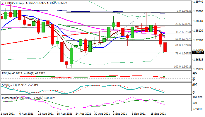 Bears extended below 1.3700 handle but faced headwinds on approach to pivotal Fibo support at 1.3647 (38.2% of 1.2675/1.4249 ascend) and also from rising thick weekly cloud (cloud top lays at 1.3698).
