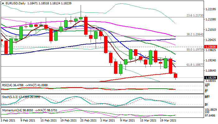 Tuesday’s bearish acceleration generated strong bearish signals on eventual break of pivotal Fibo support at 1.1887 (61.8% of 1.1602/1.2349) and marginal close below 200DMA (1.1852).