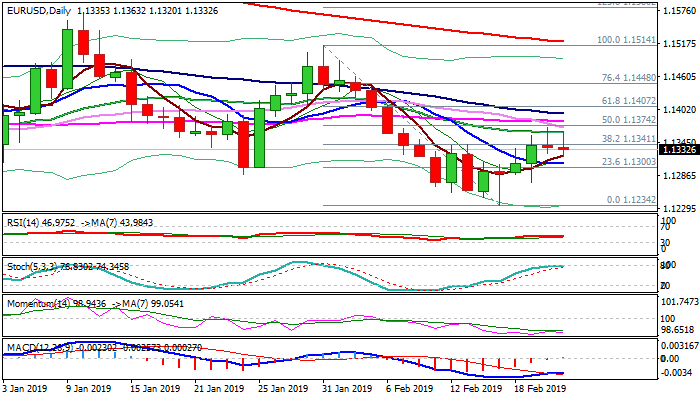 Wednesday’s Doji with long upper shadow signaled strong indecision, as the pair failed to close above cracked pivotal Fibo barrier at 1.1341 (38.2% of 1.1514/1.1234), generating initial signal of possible recovery stall.