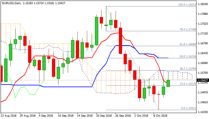 Key barriers lay at 1.1572 (cloud top) and 1.1578 (Fibo 38.2% of 1.1815/1.1432 fall) and sustained break here is needed to complete reversal pattern on daily chart and signal stronger recovery towards 55SMA (1.1590) and converged 20/30SMA’s (1.1616).