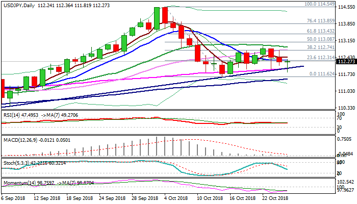 The pair extended weakness to 111.81 on Thursday, as yen benefited from recent risk aversion, but probe through key supports at 111.96 (rising 55SMA / trendline support) were so far short-lived, despite magnetic daily cloud twist (111.47).