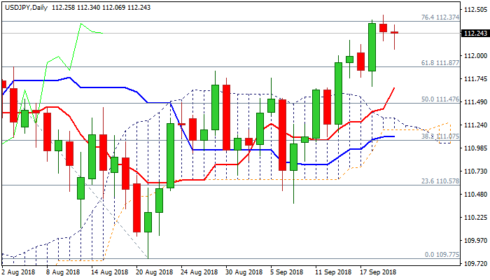 Further bearish signal could be expected on break below 111.95 (Fibo 23.6% of 110.38/112.44 upleg), with confirmation of reversal seen on extension and close below pivots at 111.76/67 (rising 10SMA / Fibo 38.2% of 110.38/112.44).