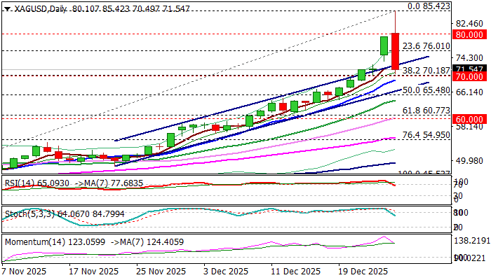 Silver fell sharply in a turbulent Monday’s trading, after hitting a new record high above $85 at the start of Asian session.