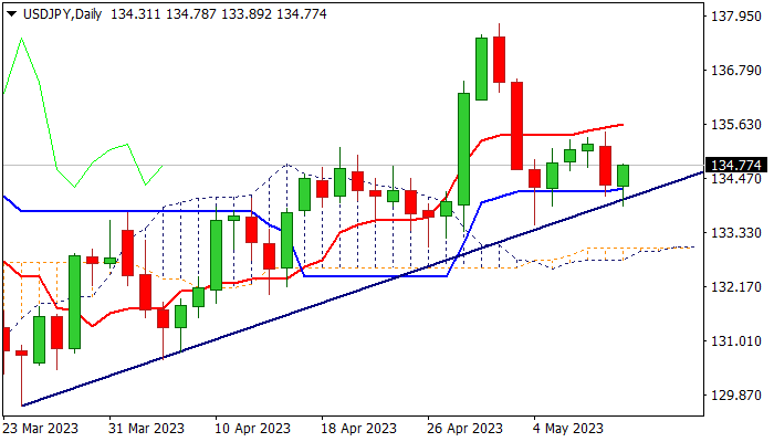 The USDJPY edges higher in early Thursday, keeping slight bullish bias as recent drops (larger pullback from May 2 peak at 137.77 and Wednesday’s dip) were contained by rising bull-trendline off 129.61 (Mar 24 low) and also registered several daily closes above daily Kijun-sen (134.27).