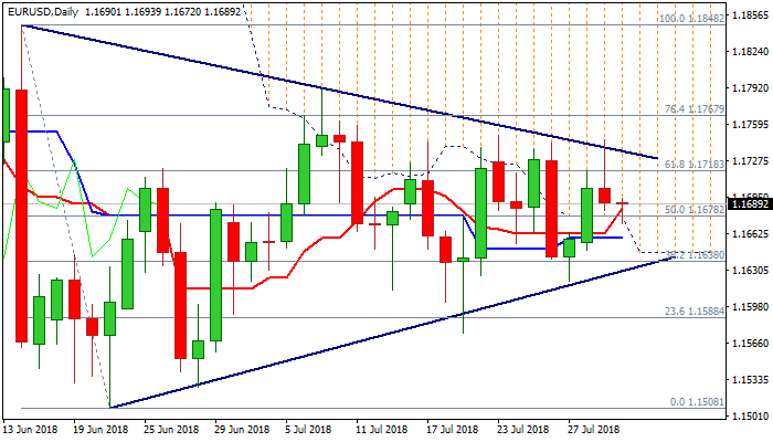Bearish scenario on sustained break below triangle support line (1.1633) would shift focus lower and expose supports at 1.1574 (19 July spike low) and key point at 1.1508 (21 June low).