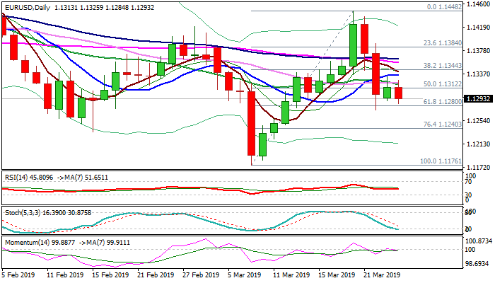 Eventual break of 1.1280 Fibo support would risk extension towards 1.1240 (Fibo 76.4%) with stronger bearish acceleration to expose psychological 1.1200 support and key 1.1176 support (2019 low, posted on 7 Mar).