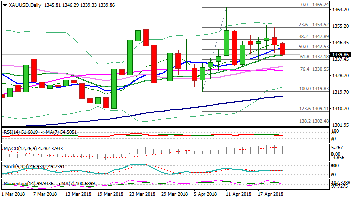 Break below pivotal supports at $1339/37 (20SMA / Fibo 61.8% of $1319/$1365) would further weaken the structure and generate stronger bearish signal for extension towards daily cloud, spanned between $1334 and $1328.