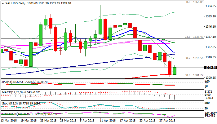 Gold price bounces on Wednesday after hitting four-month low at $1301 on Tuesday’s bearish acceleration which also cracked strong support provided by 200SMA at $1303.
