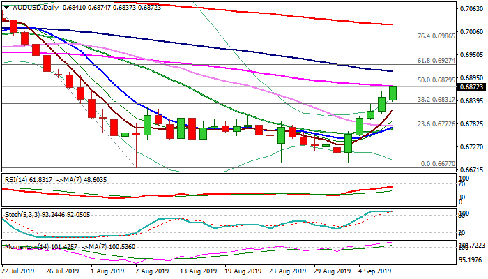 Rising bullish momentum and multiple MA’s bull-crosses (5/10; 5/20; 5/30; 10/20) on daily chart, add to positive outlook, as fresh bulls crack strong resistances at 0.6874/79 (55DMA / 50% retracement of 0.70820.6677 descend).