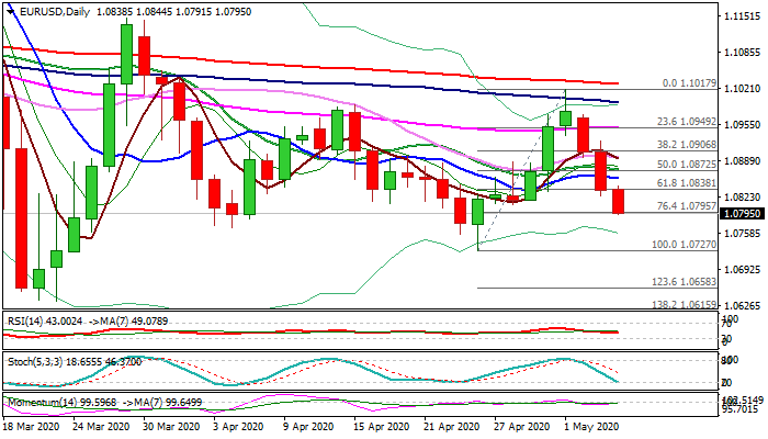 Steep fall extends into third day and probing below 1.08 support in European trading on Wednesday. Fresh bears hit the lowest in almost two weeks after bearish signal was generated on Tuesday’s close below important Fibo support at 1.0838 (61.8% of 1.0727/1.1017).