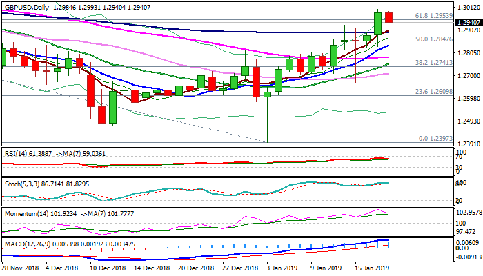 Bullish daily techs underpin, but overbought conditions and bearish divergence on slow stochastic warn of further easing before fresh attempt through 1.30 barrier.