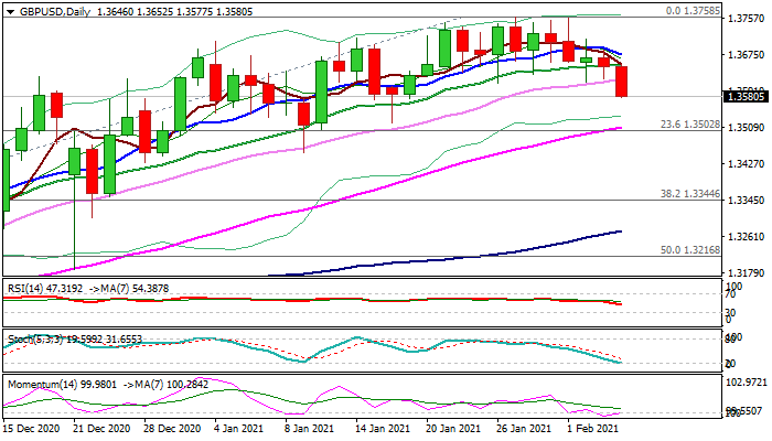Fresh bears focus pivotal supports at 1.3508/02 (55DMA / Fibo 23.6% of 1.2675/1.3758), violation of which would add to reversal signals and open way for further weakness.