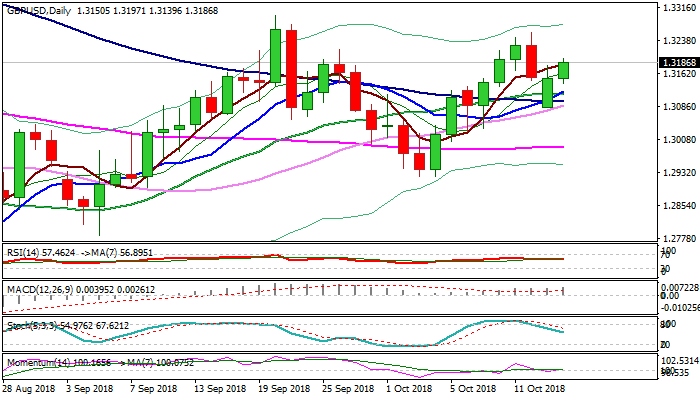 Cable remains constructive and pressures 1.3200 barrier, as fresh strength broke above previous day’s high at 1.3181 and also dented pivotal Fibo barrier at 1.3191 (Fibo 61.8% of 1.3257/1.3083 bear-leg) in early Tuesday’s trading.
