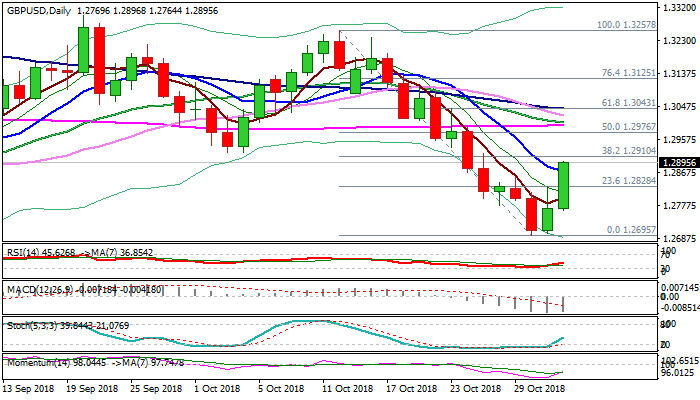Fresh rally threatens to more seriously dent larger bears, as recovery rally hit one-week high at 1.2883 and cracked important barrier at 1.2870 (falling 10SMA) and eyes another pivotal barrier at 1.2910 (Fibo 38.2% of 1.3257/1.2695 fall).
