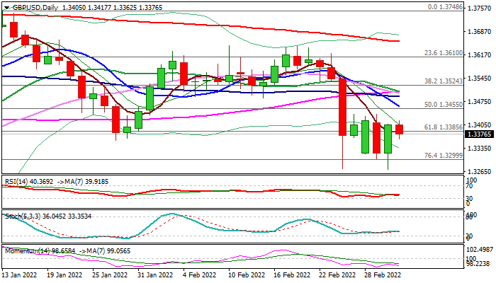 The ceiling of near-term range (1.3438) and daily cloud base (1.3454) mark solid resistances which should keep the upside limited and maintain bearish stance.
