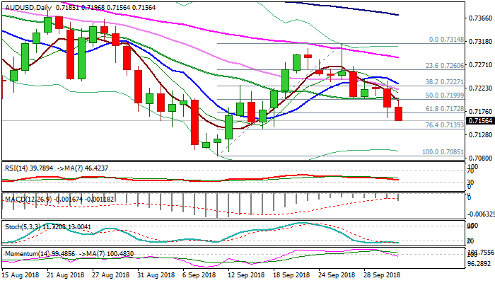 Bears look for close below 0.7172 pivot to generate negative signal for test of 0.7140 (Fibo 76.4% / 17 Sep trough), with extension towards key support at 0.7085 (11 Sep low) not ruled out.