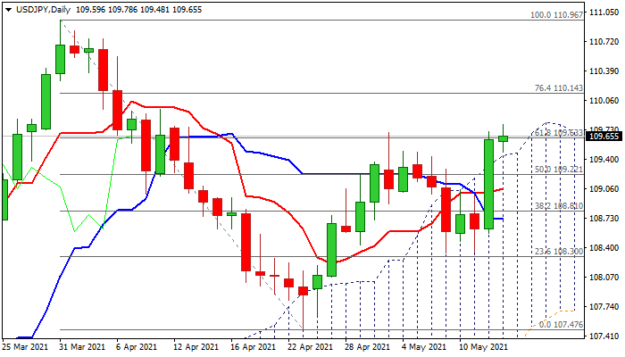 Rising thick daily cloud underpins the near-term action which eyes psychological 110.00 barrier, with daily close above 109.63 (Fibo 61.8%) to confirm bullish stance.