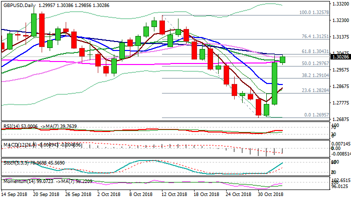 Penetration and close in the daily cloud on Thursday was bullish signal, reinforced by denting a cluster of daily MA’s (55/20/30) at 1.3000/25 zone, with today’s fresh attempts to extend rally, resulting in testing pivotal barrier at 1.3043 (Fibo 61.8% of 1.3257/1.2695 fall, reinforced by 10SMA).
