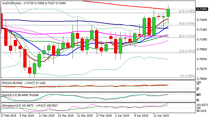 Stronger than expected data from China that showed faster than expected economic growth, boosted Australian dollar for probe above key barriers at 0.7183/93 (cracked Fibo 61.8% of 0.7295/0.7003 descend / 200SMA).