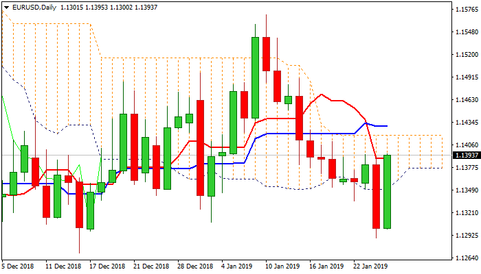 Rebound cracked the lower boundary of strong 1.1381/1.1418 resistance zone (10/20/30 SMA’s / Fibo 38.2% of 1.1569/1.1289 descend / daily cloud top), but close above these barriers is needed to confirm reversal.
