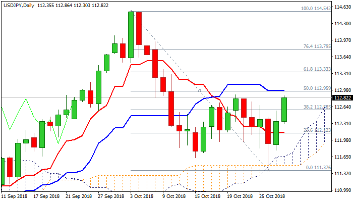 Break above pivotal barriers at 112.88 (22 Oct high) and 112.95 (50% of 114.54/111.37 descend / daily Kijun-sen) would signal extension of recovery rally from last Friday’s 111.37 spike low and would expose next pivot at 113.33 (Fibo 61.8% of 114.54/111.37).