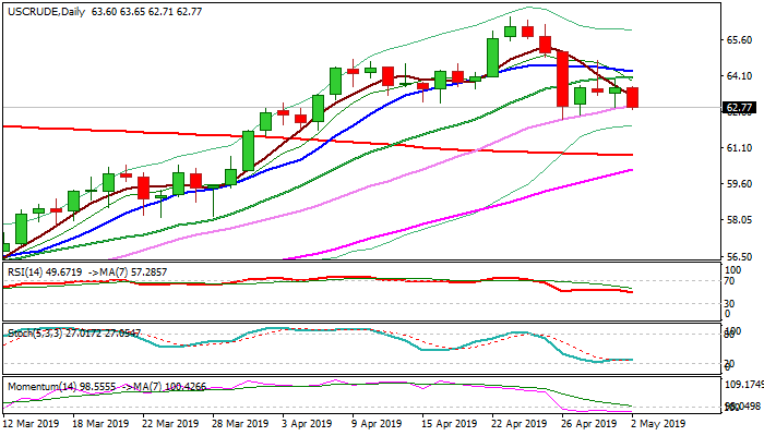 WTI oil price fell below $63 handle on Thursday, pressuring strong supports at $62.81/76 (rising 30SMA / Wednesday’s low), weighed by record US crude production that resulted in strong rise in US crude inventories (EIA report on Wednesday showed 9.9 mln bls build compared to forecasted rise of 1.4 mln bls).