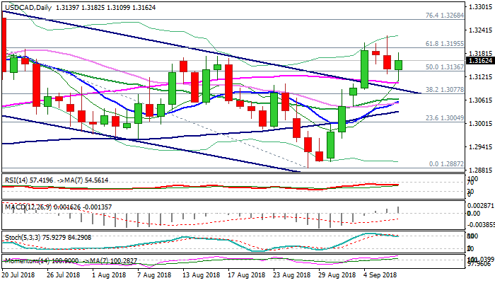 The USDCAD’s near-term structure firmed after today’s bounce, as downticks were contained by 55SMA and post-data rally looks for renewed attempt through cracked pivot at 1.3195 (Fibo 61.8% of 1.3386/1.2887 descend, close above which would be bullish signal for continuation of recovery leg from 1.2887 (28 Aug low).